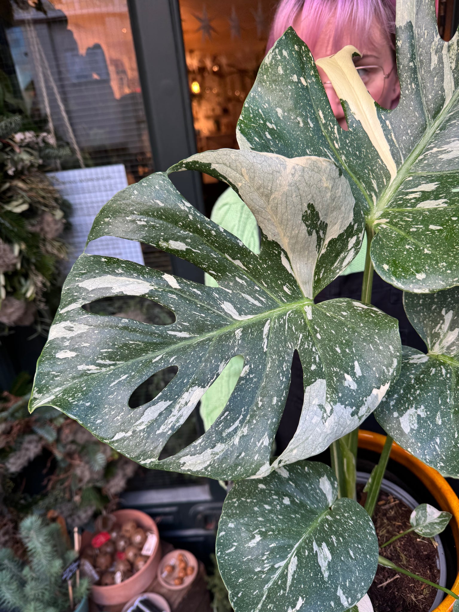 TIPS: The Monstera Thai Constellations prefer soil with high organic matter. Add in bark and perlite as drainage and an airy mix are important. Keep warm above 18. Can grow to 6ft+. The variegation on the Monstera Thai Constellation is stable, which differentiates it from the variegation on the variegated Monstera deliciosa. Repot every 2 years one size up.