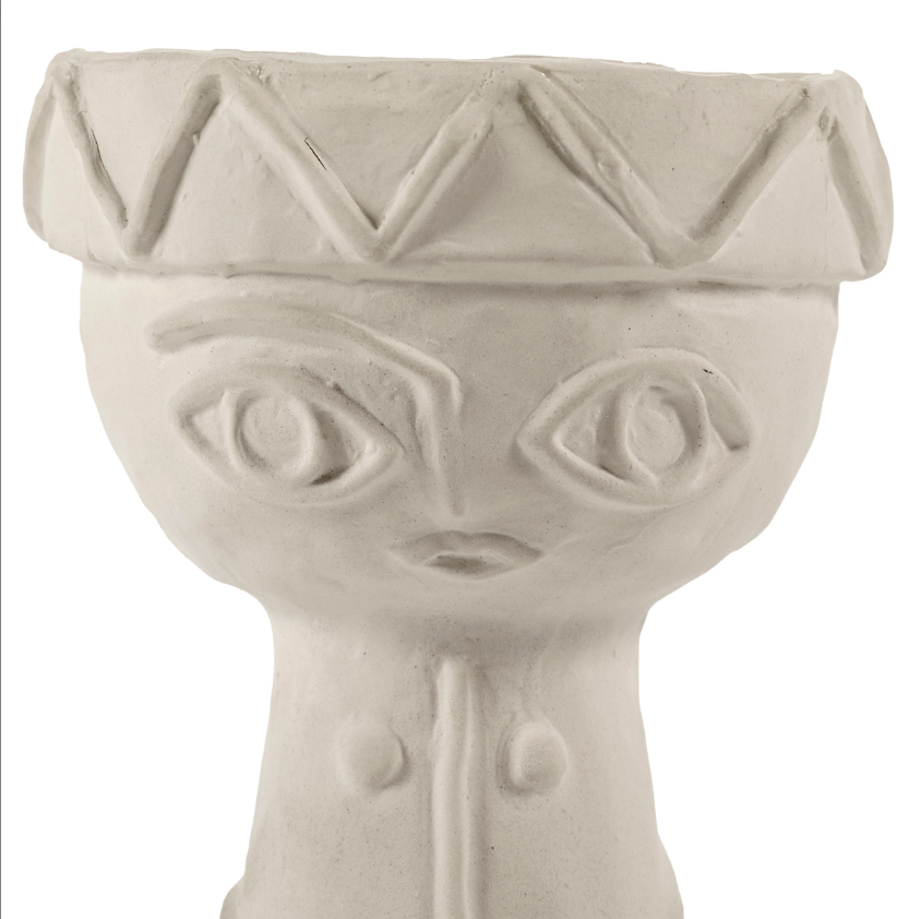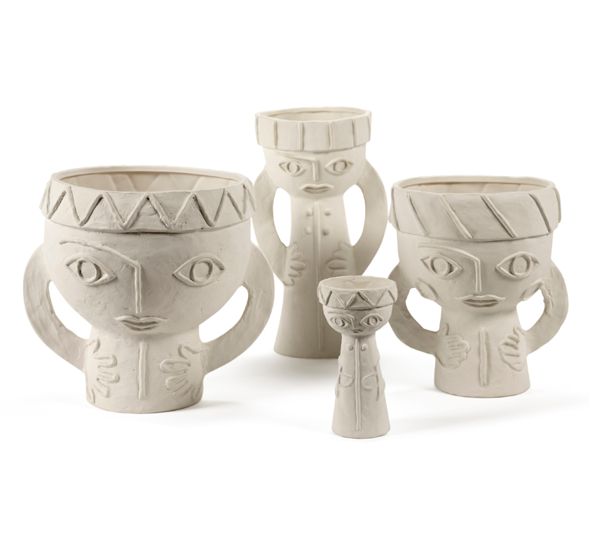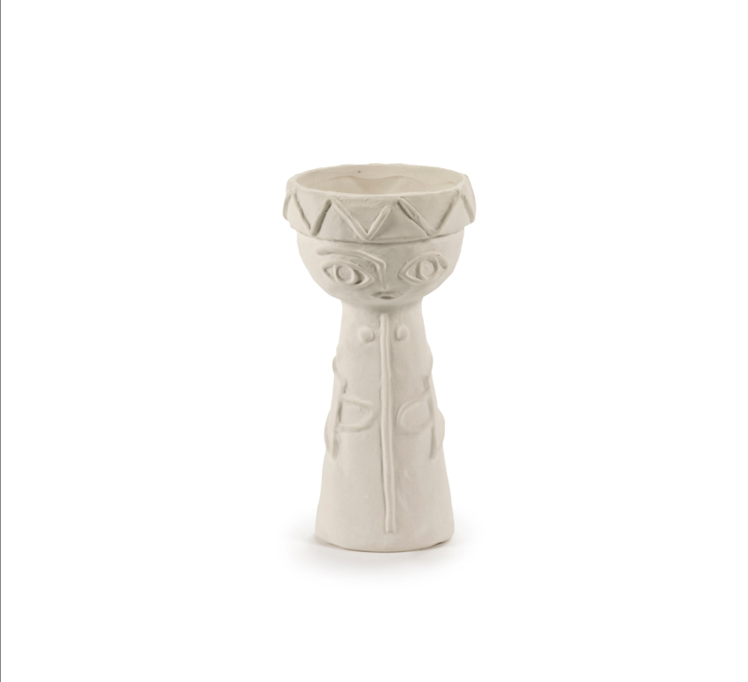 The Les Femmes collection of vases was inspired by the universal image of a strong woman. Designer Marie Michielssen always emphasizes hands and eyes in her designs. Our eyes are the mirror of our soul while hands symbolize softness and caring, as well as creativity. Small, refined details, such as the decorative elements on the clothing and headwear, contrast with the somewhat rougher appearance of the chamotte that Marie added to the clay. The inner surface and base have been finished with a transparent, matte glaze.